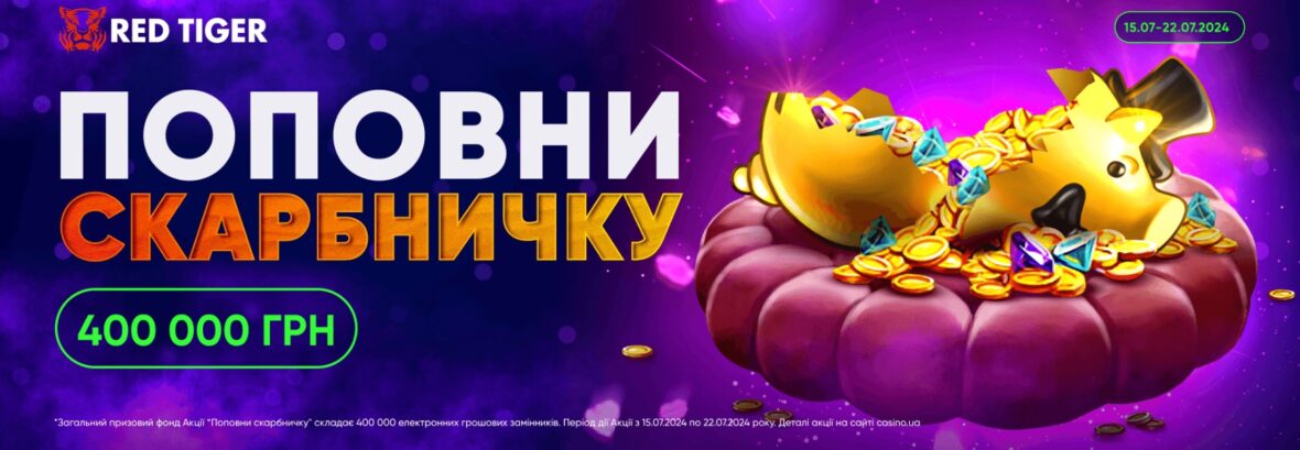 В онлайн казино CASINO UA розпочалась нова мережева акція, яка отримала назву «Поповни скарбничку». Сумісно з авторитетним розробником Red Tiger оператор розіграє призовий фонд номіналом 400 000 гривень.