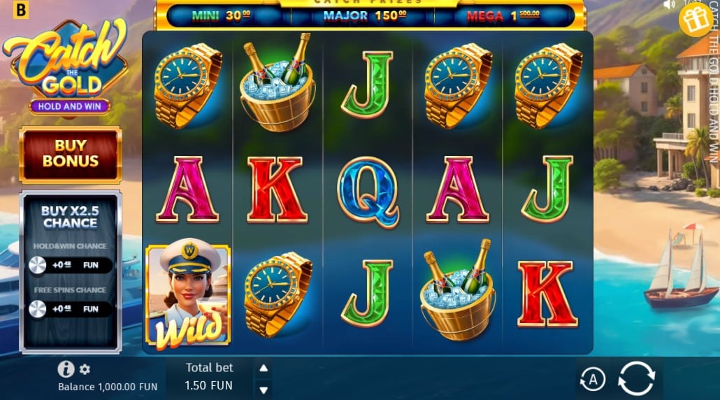 Почавши гру на слоті Catch The Gold Hold And Win, ви вирушите в захопливу подорож на круїзному лайнері. Як лоти гри обрано відповідні цій тематиці предмети: дорогоцінні камені, прикраси. Лот Wild дає змогу замінити будь-який символ, а Scatter активує запуск бонусної гри.